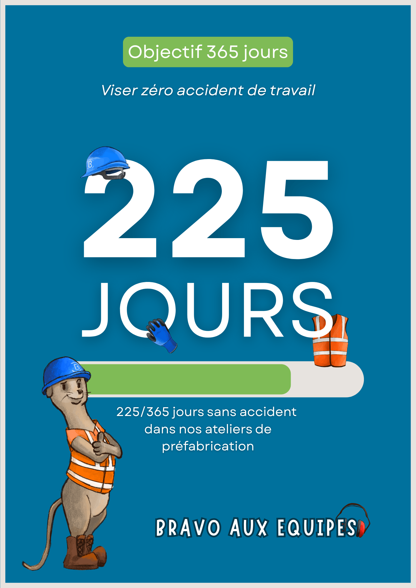 Les équipes des ateliers de préfabrication bois et béton ont atteint une étape majeure : 225 jours sans accident. Cette réussite fait partie du challenge “0 accident de travail à la préfa”, lancé il y a 7 mois, et reflète l’engagement quotidien, la vigilance et les bonnes pratiques de chaque collaborateur.