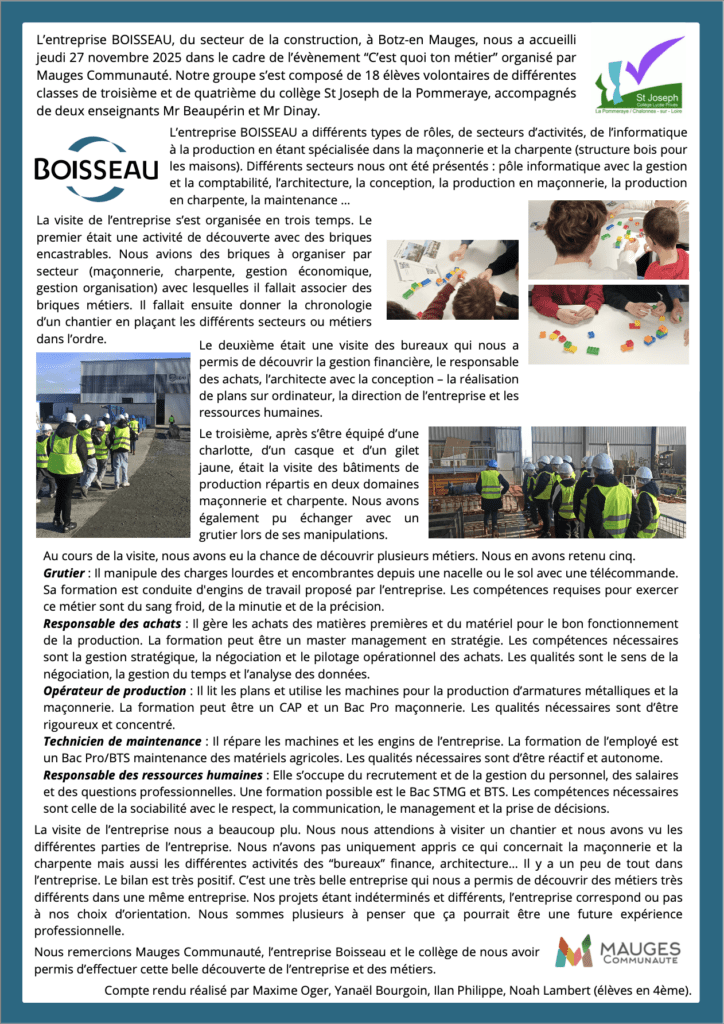 Depuis plusieurs années, nous participons avec enthousiasme au dispositif « C’est quoi ton métier ? », organisé par Mauges Communauté. Cette initiative permet aux élèves de 4ème et 3ème de découvrir concrètement le monde du travail et d’explorer différents métiers.