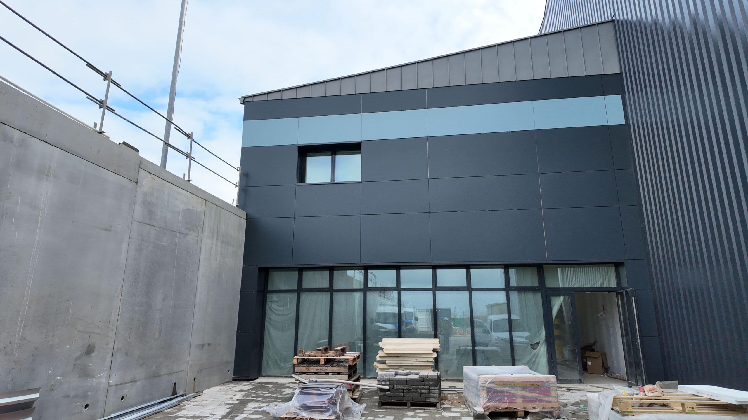 Les travaux ont débuté par des terrassements généraux et la réalisation des fondations, incluant l’étanchéité des ouvrages enterrés. Le dallage ainsi que les réseaux d’eaux pluviales et usées ont été mis en œuvre afin d’assurer la fonctionnalité du bâtiment.